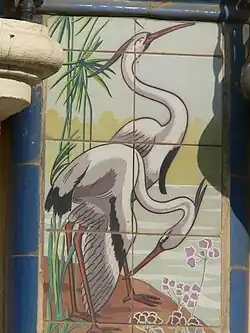 Las pilastras se rematan con dos pequeñas columnas tornasoladas sobre las que se apoyan pomos bulbosos. En el inicio de las pilastras, en la parte superior de la planta baja aparece una decoración policromada con imágenes de cigüeñas, que dan el nombre a este edificio.