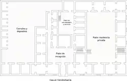 Edificación de dos plantas, se estructura a través de un acceso principal, que conduce a un primer patio de recepción y la conexión con los otros patios se hace a través de chiflones y escaleras. Los patios se destacan por su gran tamaño; el patio de recepción tiene aproximadamente 10 m de lado, los patios secundarios entre 10 y 15 y el canchón o área libre de más de 15m de lado.[3]