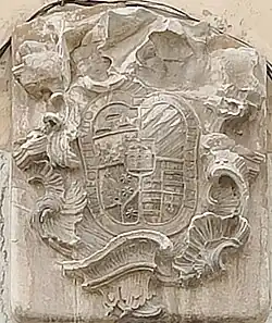 Sobre el dintel de la portada principal se ubica el escudo de armas familiar, todavía en su posición original. Creado en estilo Luis XV,[3] durante la guerra civil se destruyó su remate. De forma ovalada presenta un cuartelado combinando las armas de Manuel Vallés y Pallarés y de su esposa Isabel Ferrer y Funes Muñoz de Casalduch, así el primer cuartel lo ocupan las armas de los Vallés, el segundo las de los Ferrer, el tecero las de los Pallarés y el cuarto las de los Funes,[7] y sobre un escusón las armas de los Casalduch.[3] Todo ello rodeado por uan bordura con una versión del lema familiar de los Vallés, «MEA•FOR•TITVDO•VALLIS•AL•TITVDO•EST», cuya divisa realmente era «Vallis Altitudo est mea Fortitudo», «‘La altura del valle es mi fuerza’». Por timbre portaba una corona.[3]