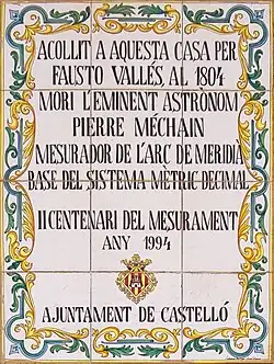 En 1803 el VIII barón de la Pobla Fausto Vallés acogió en su casa al astrónomo francés Pierre Méchain, que había acudido a Castellón con motivo de sus trabajos para medir la longitud del meridiano de Greenwich, que en esa época ya se conociía que se cruzaba con el paralelo 40° norte en un lugar indeterminado del municipio.[4] En sus correrías por los alrededores de la zona Méchain contrajo paludismo, falleciendo en esta casa el 20 de septiembre de 1804, siendo enterrado en el cementerio del Calvario, lugar que ahora ocupa el parque Ribalta. En el laboratorio de Vallés Méchain lograría definir el valor del metro.[5] Tiempo después sería el lugar donde se hospedó el rey Alfonso XII en su única visita oficial a la ciudad.