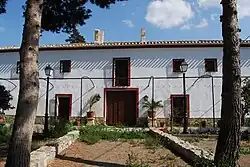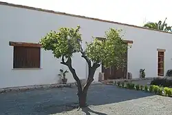 Conserva un edificio principal de dos plantas, encalado en blanco al exterior con cornisas, esquinas, ventanas y puertas enmarcadas en una franja granate, y en el que residían los propietarios de la finca. Las ventanas conservan el enrejado de hierro original.