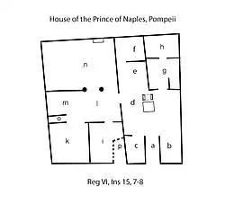 - ↑ a b c Dunn, Jackie; Dunn, Bob. «VI.15.8 Pompeii. Casa del Principe di Napoli or House of the Prince of Naples - Part: 1» (en inglés). Consultado el 30 de septiembre de 2022.