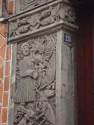 Lo más destacado del inmueble es la puerta de acceso, compuesta de dos jambas amplias rematadas por un dintel proporcionado en estilo plateresco. El basamento y capitel de las jambas es sobrio; en la planta baja se perciben tres rosetes estilizados a la usanza indígena, en tanto que la sección alta alberga ornatos vegetales entrelazados con aves. Los motivos de las jambas son escenas de cacería, en las que aparecen caballeros sosteniendo perros. La composición de los tableros y los trajes de los cazadores sugieren que los relieves son una copia de los tapices franceses o flamencos de la segunda mitad del siglo XV.[5]