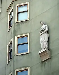 La fachada de la casa estructura sus aperturas en ejes horizontales. Sin embargo, se distinguen diferentes tipos de ventana, que expresan exteriormente los distintos usos interiores de cada una de las plantas. La parte originalmente destinada a oficinas ocupaba la planta baja, el entresuelo y los tres primeros pisos, que se abren al exterior mediante tres niveles de ventanas rectangulares. Las tres plantas superiores, destinadas a viviendas, se manifiestan en el exterior por medio de ventanas menos numerosas. Por último, en el ático, concebido como residencia de la propietaria, hay siete ventanas apaisadas, del tipo Chicago (Chicago windows). Los muros de la fachada están revestidos con un revoco de mortero verde.[2]