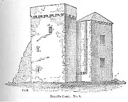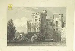 - Castillo de Powis La puerta del este parece haber sido originalmente una Casa-Torre, a la que se le hizo una entrada a través del sótano abovedado, probablemente en el siglo XVII. Se añadió un piso adicional a la torre en 1815-1818 cuando Robert Smirke volvió a reformar el castillo y agregó almenas de estilo gótico.[13] Sin estas adiciones y alteraciones, la Puerta Este es muy similar a las casa-torre en la Torre cerca de Mold y Angle en Pembrokeshie. Esto se ilustra en la impresión de JP Neale de 1829.