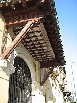 Destacan el uso de rejería en los balcones superiores que comparte los modelos de rejería del siglo XIX tan habituales en otras zonas de la ciudad. También es interesante la profusa decoración de la fachada que remite a modelos neoplaterescos y el empleo de la cerámica.