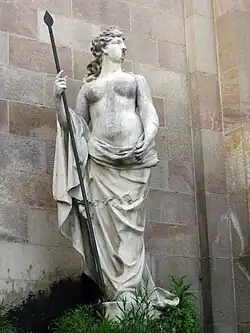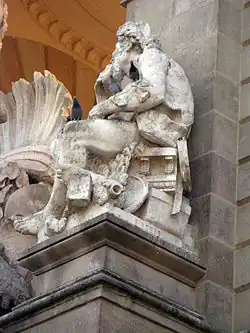 | Venus (frontón) | Francisco Pagés Serratosa | Mármol blanco | 3,91 x 1,60 x 1,05 m | En el frontón del conjunto se sitúa una figura de Venus, la diosa de la belleza y el amor, nacida en el mar. Se halla recostada sobre un pez de aire grotesco, y la acompañan cinco putti con conchas y caracolas marinas.[7] | |