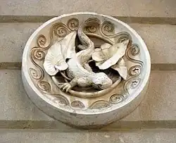 | Medallones del lagarto | Antoni Gaudí | Piedra caliza | Junto a la entrada del Aquarium, en la parte superior del monumento, se hallan dos medallones con lagartos en relieve, diseñados por Gaudí, autor del proyecto hidráulico del conjunto. El diseño de los animales es bastante naturalista, y recuerda las figuras del ábside de la Sagrada Familia que el arquitecto modernista realizaría años después.[16] |