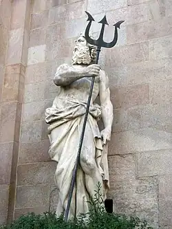 | Neptuno | Manuel Fuxá | Mármol blanco | 2,85 x 1,03 x 0,80 m | Neptuno, dios del mar, forma pareja con la figura anterior. Como ella, dirige su vista hacia los caballos marinos, y sostiene entre sus manos un tridente, el habitual atributo iconográfico de este dios. La figura está en contraposto, que denota una tensión latente que contrasta con la actitud tranquila de su figura opuesta, Anfítrite. Una copia de esta estatua se encuentra en el parque de la España Industrial.[13] | |