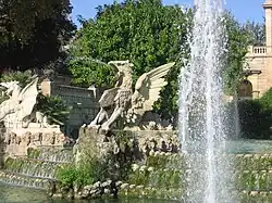 | Grifos | Rafael Atché | Mármol blanco | 3,97 x 3,24 x 1,92 m | Los grifos son animales mitológicos, mitad león y mitad águila. Se encuentran en el estanque, entre las dos láminas de agua que lo forman, y hacen de surtidores, gracias al agua que sale de su boca. Hay cuatro, cada uno de ellos diferenciados y con peculiaridades propias: uno tiene la cabeza de águila mientras que los otros tres la tienen de león; igualmente, las alas de cada figura son distintas, desde unas parecidas a las de un murciélago hasta otras con plumas o escamas. Quizá por su naturaleza fantástica estas figuras no son tan realistas como el resto del conjunto, y denotan un sello estilístico más estilizado y ornamental, por lo que se las considera como precedentes del modernismo.[15] | |