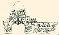 Las decoraciones del casco representan una serie de criaturas míticas y una ilustración, en cada pómulo, de una representación ritual.[7]