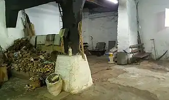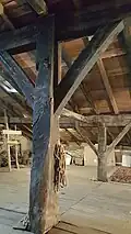 La estructura de este edificio estaba formada por postes-ejes enterizos y cuatro bernias correspondientes al lagar de viga del siglo XVI. Actualmente subsisten 21 postes de madera enterizos de los 24 originales, pues tres desaparecieron al construir el cuerpo adosado al edificio en su sector NW. Estos postes sostienen una armadura de largas vigas, tornapuntas, cabezales (algunos tallados) y la gran techumbre de largos cabrios que la forman. Un tabique sencillo de piedra y ladrillo separa ambas viviendas. Las cocinas-hogares y viviendas ocupan el tercio SE del caserío, en plantas baja y primera.