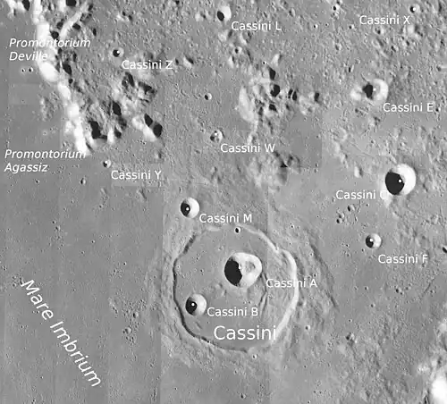 ![]() Cráter Cassini (Detalle de la cartografía tomada por la misión espacial Lunar Orbiter 4 en 1967) | ||