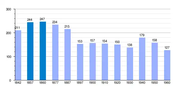| Gráfica de evolución demográfica de Castejón del Campo[5] entre 1842 y 1960 |