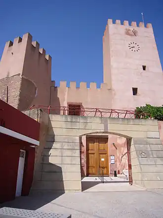 Se encuentra en el centro de la población, frente a una plazoleta en el núcleo urbano más antiguo del pueblo, que es también el punto más elevado de la pequeña loma donde se asienta, dominando visualmente la misma.[2][4]​ Originalmente fue una fortaleza islámica, que sería aprovechada por los conquistadores cristianos. Desgraciadamente, de este edificio primitivo apenas nada queda ya que fue demolido en 1364 por orden de Pedro II tras las Guerras de la Unión, redificándose por completo con posterioridad.[4]