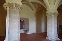 En el gran salón del primer piso, el techo en forma de óvado, abovedado, se apoya en cuatro columnas, y se eleva en un entresijo de venas esculpidas.[2] Una celosía similar, aunque más pequeña, se utiliza en los pisos restantes. Por las torres cilíndricas del oeste, una escalera circular da acceso a los pisos sucesivos.[2]
