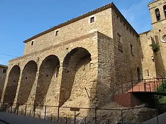 En el lado este destaca el gran portal de medio punto adovelado, de donde sale en dirección hacia la iglesia hasta llegado a la puerta del campanario de esta, un muro que presenta cinco aspilleras estrechas, una tocada por arma de fuego, y casi todas situadas en la parte inferior del muro. En la parte alta hay una ventana gótica trilobulada. Este muro conserva en su cara interna el arranque de dos arcos apuntados, como si hubiera habido una nave paralela. Junto al portal adintelado, el muro gira en ángulo recto y presenta dos aspilleras estrechas distribuidas a diferentes alturas. La fachada donde está ubicado el portal presenta varias aspilleras distribuidas a diferentes alturas, una ventana y un balcón con dintel adintelada. La fachada termina con una galería y debajo de esta encontramos una hilera de aspilleras. La ventana, la galería y el balcón corresponden a una reforma posterior del edificio que se puede observar claramente en el cambio del paramento que hasta bajo la ventana era de sillares regulares de piedra más o menos rectangulares y que a partir de este punto está construido de piedras irregulares. El lado sur presenta una fachada con tres salidas a la azotea, que fue construida añadiendo cuatro grandes bóvedas en el edificio, y tres ventanas también con dintel encima de las puertas.