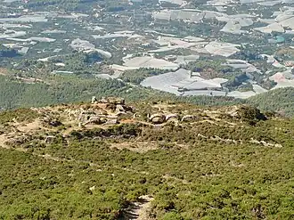 Vista de la Sierra de Bernia en un día de niebla, desde el fuerte de Felipe II (vertiente sur). Se puede observar en la parte inferior de la foto la capilla del fuerte.