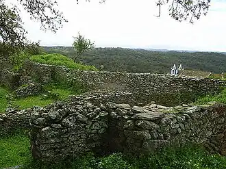 Una legua de Castro por el Sur, en difícil montaña, en el lugar de S. Pedro das Cabeças ha signaes de fortaleza... y de otros, uno de los Reyes, otro de las Juntas; [...] El de la Señora de la Colla tiene más de 800 escalones en circuito, en una inminencia impracticable por todos lados, quedando en uno de los delles la unión de dos arroyos (Odemira, Mariscão). En los puntales de las colinas que la rodean por dos lados hay rastros de vados que eran una especie de reductos, y torres de vigilancia, que advertían, y dificultaban el paso, dispuestos de habitación en habitación de legua y menos. La idea de que hoy en día se puedan formar los restos de los vencejos, para que los no vencejos puedan avanzar en las excavaciones, es de juicio incierto en muchos aspectos: podrían ser de los romanos, moros y tal vez de los antiguos lusitanos que vivían "más espartanos", como dice Strabão. Las paredes tienen 12 palmas de ancho, sin la aleación de Vitruvio; en parte están formadas por secas lagunas superpuestas. La fortaleza de la Colla tiene como centro una antigua cisterna: la valla consiste en una simple cortina de la que emerge una obra angular de muy pequeña extensión de un espacio a otro, y quizás sean sus bastiones. Hay dos espacios e intervallos más divididos por dos antemuros, sin ningún trabajo de reinstalación capaz de cometer errores, pero tal y como les serviría en lugar de revelar o media luna. Los pequeños cuerpos angulares podrían usarse para flanquear las torres de lanzamiento. No había rastros de torres, y no servían para nada, porque las fortalezas eran caballerosas, y ganaban cualquier elevación de tierra... en la orilla de uno de los arroyos están por mucho tiempo las tumbas; en la ladera de la montaña encontramos seis tumbas, y algunas de 25 palmas en un cuadro.[4]