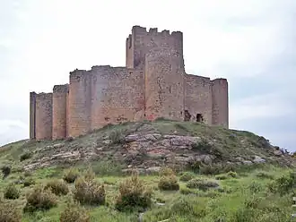 La torre del homenaje está adosada a la cerca en el extremo oriental, tiene planta cuadrada y contaba con cuatro pisos, cubiertos con bóveda de cañón apuntado. La planta baja se estima que servía de capilla y consta de un tramo rectangular con bóveda de cañón, su entrada se encuentra en el lado derecho de la torre. Estaba iluminada por tres aspilleras situadas dos en el muro occidental y otra en el centro del ábside. El acceso al resto de pisos se realizaba por la segunda planta, donde hay una pequeña puerta en arco de medio punto en la cara norte.