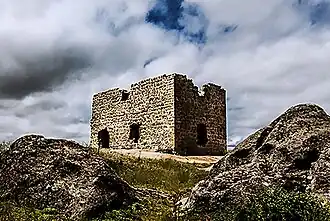 Se denomina también Castillo de los Moros . Sus muros son de mampostería de un metro de anchura aproximadamente, con núcleo de argamasa y revestidas sus caras, abarcan una superficie muy vasta, recorriendo los límites de la meseta en donde se asienta. En uno de ellos se aprecian unas ventanas aspilleras toscas. En el punto más alto, aislado del recinto, se levanta un torreón de planta rectangular de sillarejo con refuerzo de sillares en esquinas y vanos, distribuido en dos alturas