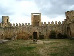 A pie del conjunto del homenaje se ubica un recinto cuadrangular formado por altas murallas almenadas con un paseo de ronda y sendas torres redondas en los vértices exteriores. En el recinto estaba el patio de armas, bajo el cual hay un gran aljibe con un pozo central, y a los lados estaban los edificios destinados a residencia en el sur, se pueden observar aún los ventanales adornados por capiteles historiados, y para usos auxiliares (bodegas, almacenes, cuadras, etc.) al norte.