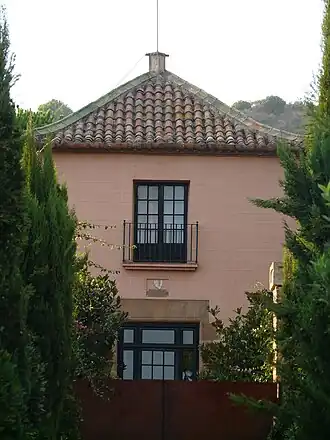 Los cuerpos laterales son de cubierta de vigas de madera a dos aguas y constan de planta baja y buhardillas. En el acceso del jardín posterior se alza una escalinata, con barandilla de hierro, al pie de la cual se encuentran dos leones de piedra. Encima el dintel de esta puerta hay un relieve de un cabo romano, posible resto de una obra anterior.