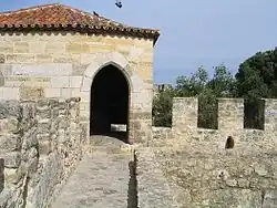 El castillo defiende la antigua ciudadela árabe, o alcázar, abriéndose en sus muros con almenas doce portones, siete de ellos por el lado de la iglesia de Santa Cruz do Castelo. Por el exterior, un paño de muralla da acceso a una torre barbacana. Dieciocho torres de sustentación refuerzan los muros. Por el Portal Sul, a través de la Rua de Santa Cruz do Castelo, se accede a la Plaza de Armas.
