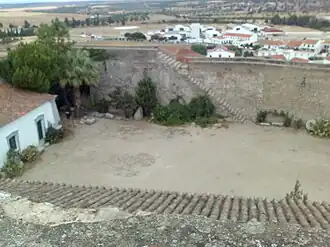 La valla del pueblo tiene una planta ovalada, reforzada por cubos y torres de planta cuadrangular y semicircular, coronada por merlones prismáticos. Originalmente tenía tres puertas monumentales (Porta de Moura al noreste, Porta de Beja al noroeste y la Porta de Sevilla al sur, esta última ya desaparecida) flanqueadas por dos torres cilíndricas achaflanadas, esta última con merlones pentagonales en los extremos. El panel occidental de los muros está coronado por un acueducto que descansa en una arcada redonda, que une el Palacio de los Condes de Ficalho en el lado norte y una gigantesca nuera que descansa en un pozo, en el ángulo sudeste, construido en el siglo XVII para abastecer el palacio. En un período posterior se abrieron la Porta da Corredoura y la Porta Nova.