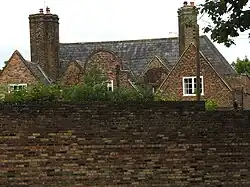 Los edificios principales del castillo están situados en el lado este de un patio rectangular en el que se encuentran dos grandes robles de Turquía, de los que se dice que han sido cultivados a partir de bellotas traídas de Crimea después de la Guerra de Crimea.[18] Un muro cortina de piedra rematado con ladrillos y de aproximadamente 1 m de espesor y 4 m de altura rodea el patio. Se entra al patio por el lado noroeste a través de una caseta de entrada de cuatro pisos con cañones para obtener fuerza defensiva adicional. Fue reconstruido sustancialmente en la década de 1650 después de haber sufrido graves daños en un incendio en 1653, cuyos rastros aún se pueden ver en forma de piedras chamuscadas en las paredes del primer piso.[18] Una puerta central con un arco redondo conduce a un pasaje que da acceso al patio. Sobre la puerta de entrada hay un reloj de finales del siglo XVIII que se insertó en la estructura existente. A principios del siglo XIX, se agregó un campanario de madera, y una moderna asta de bandera remata el edificio.[13]