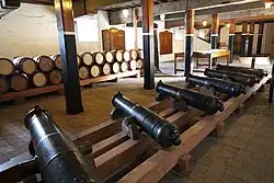 Una escalera circular dentro del edificio da acceso a la plataforma principal de armas del castillo o al bastión de agua, una estructura triangular baja que se proyecta hacia el río. El armamento principal del castillo estaba montado aquí al aire libre; ahora está representado por seis cañones de mediados del siglo XIX que todavía están en sus carros originales.[13] Hay nueve zonas en el bastión, seis orientadas hacia abajo y tres hacia arriba, con un parapeto redondeado diseñado para desviar los disparos.[16] El bastión de agua también fue protegido por una empalizada de madera que sigue su curso triangular unos metros más allá en el río. La actual empalizada es una recreación moderna de la estructura original.[13]