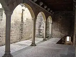La entrada se sitúa en la fachada principal, abierta en el muro sudoeste mediante puerta ojiva. A la izquierda de la misma se sitúan las caballerizas y alojamientos de servidumbre. En el frente se sitúa una gran sala rectangular con poyal que recorre todo el recinto excepto los vanos. Subsisten los arcos rebajados que sostendrían los forjados a modo de arcos diafragmas. De las salas restantes se conservan los muros, ventanales y arcos principales. Algunas ventanas ajimezadas con decoración al exterior. En el interior, diversos arcos de medio punto empotrados en el muro. La planta alta presenta una galería de amplios arcos de medio punto y se aprecian restos de ménsulas con vuelo de un metro, decoradas con rollos, en algunos puntos. El remate almenado se realiza con tres falsas torrecillas también almenadas.