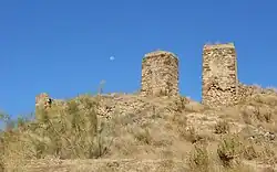 Algunas torres aún presentan restos de una coronación a modo de parapeto o merlatura de tapial, e incluso elementos para la evacuación de aguas pluviales. Se identifican restos de torres cilíndricas y rectangulares, todas ellas de mampostería ripiada en el exterior, aunque las de entrada presentan labores de cantería más trabajada en las esquinas. Como elementos no estructurales, contamos con un gran aljibe cuadrangular que se encuentra ubicado en el centro norte del castillo, dentro del recinto interior.