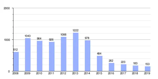 | Gráfica de evolución demográfica de El Castillo de las Guardas[2] entre 1842 y 2021 |