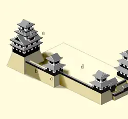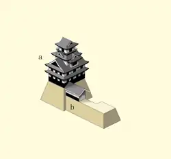 - Estilo Hashigokaku: En el último estilo, aplicado prácticamente sólo a castillos de montaña, el hon maru se localiza en un vértice, mientras que los ni no maru y san no maru van descendiendo en forma de escalera.