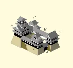 La primera edificación que solía observarse, antes que murallas o pórticos, era el tenshu kaku (天守閣?) o torre del homenaje, debido a que era la construcción de mayor altura e incluso podía ser visible a varios cientos de metros de distancia.[39]