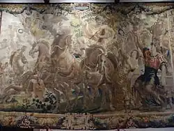 Considerados como los objetos de mayor valor histórico y artístico de la exposición, fueron hechos a mediados del siglo XVII en Bruselas. La serie más completa lleva por nombre Vida de Julio César y consta de cinco tejidos, firmados por Ian Van Leefdael y Gerardo Van der Strecken. De la serie La vida del hombre solamente se conservan dos obras, realizadas por Ian Francis y Franz Van den Hecke, sobre cartones de discípulos de Rubens, con posibilidad de participación del maestro.[22] El décimo tapiz es de tema bíblico y se desconoce su título.