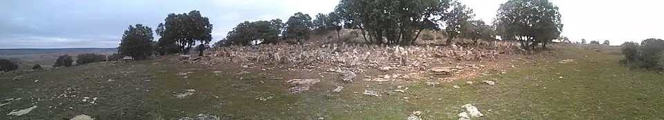 El sistema de defensa del yacimiento se completa, en el lugar más vulnerable, con unas hileras de "chevaux de frise"[1] o "campo frisio"[2] distribuidas en dos grupos de manera regular, los dos acaban en el borde del cortado, lo que hace imposible el acceso al poblado salvo por el pasillo entre ellos, de unos cuatro metros de anchura. Las caballerías y los carros deberían entrar obligatoriamente por ese pasillo y luego dirigirse al norte para pasar por la puerta, flanqueando la muralla y estando expuestos a sus defensores.