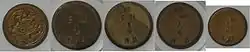 ![]() Anverso y reverso de un made beaver token con tres reversos de fichas monetiformes fraccionarias. | |||||