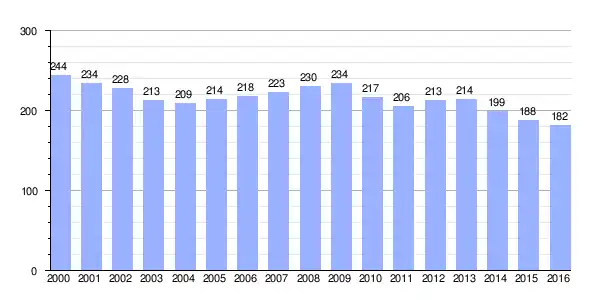 | Gráfica de evolución demográfica de Castrotierra de la Valduerna[2] entre 2000 y 2016 |