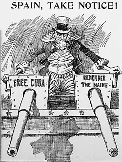 Aunque la destrucción del Maine no supuso una declaración de guerra inmediata con España, sí creó un ambiente que impedía una solución pacífica.[6] La investigación española determinó que la explosión había sido causada por la combustión espontánea de las carboneras, pero el Tribunal de Investigación de la Junta Sampson de Estados Unidos dictaminó que la explosión había sido causada por una explosión externa de un torpedo. La administración de McKinley no citó la explosión como casus belli, pero otros ya se inclinaban por entrar en guerra con España por las atrocidades percibidas y la pérdida de control en Cuba.[7] Los defensores de la guerra utilizaban el grito de guerra: «¡Recuerden el Maine! Al diablo con España!»[8][9]