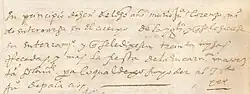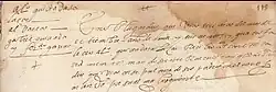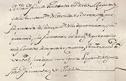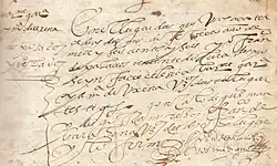 "En cinco días del mes de maio de 1595 años fallescio Juan de Palacios clérigo presvitero. Vezino deste lugar de esquivias recibió los Santos Sacramentos. Hizo su testamento ante Jeronimo de Escurieda escribano publico de este lugar dejó por su albazeas a Rodrigo Mexia y a Gaspar de Chinchilla y a Maria de Salazar Su hermana y a Gaspar Tello de Guzmán todos vezinos de este dicho lugar y mando por su anima lo siguiente..."