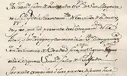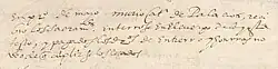 “En el Lugar de Esquivias a tres días del mes de noviembre año de mill y quinientos y noventa y siete años Juan Hidalgo teniente beneficiado babtizo a Philipa hija de Pedro de Sobarzo y de Ysabel Gardoña su muger fueron sus conpadres Fernando de Salazar Vozmediano y doña Catalina de Salazar su ermana encargoseles el parentesco spiritual testigos Antonio de Vivar Salazar y Francisco Marcos vezinos del dicho lugar y lo firme” Juan Hidalgo.
