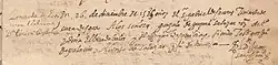 "En 12 de diciembre (1584) El Reverendo Señor Juan de Palacios tiniente desposó a los señores Miguel de Zerbantes vezino de Madrid y doña Catalina de Palacios vezina desquivias testigos Rodrigo Mexia Diego Escribano y Francisco Marcos. El Doctor Escrivano."