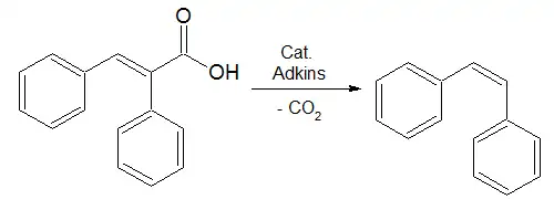 - Descarboxilación de ácido α-fenilcinámico para dar como producto el cis-estilbeno.[7]