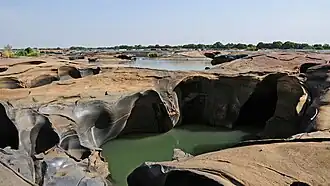 El río, de una anchura de más de 1000 m sobre las cataratas, no tiene más de 210 m aguas abajo después de cruzar un grupo de rocas. El desnivel es de unos 14 m. El caudal varía considerablemente y puede aumentar de 3 m³/s, en mayo, a 5000 m³/s en octubre (valores extremos registrados en la boca).