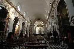 La iglesia actual fue construida en el siglo XIV y reconstruida en 1607-1617 en una restauración barroca, incluyendo decoración de estuco y pinturas de Gregorio Preti, Salvator Rosa, Giovanni Francesco Guerrieri, Giuseppe Puglia y Orazio Gentileschi. El ábside pertenece a la catedral original del siglo XIV, al igual que el claustro y la capilla de San Lorenzo con frescos (C. 1360) de Allegretto di Nuzio. La iglesia también tiene frescos que representan la Historia de la Verdadera Cruz (1415) de Giovanni di Corraduccio.