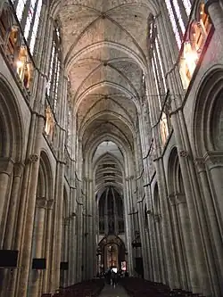 El interior, con planta de cruz latina, tiene una zona principal en la que destacables vidrieras realzan el espacio, dividida en tres naves con enormes polistilos (pilastras complejas) que sostienen la arcada protogótica hecha por Gauthier Varinfoy, la galería del triforio y el claristorio, insertos sobre las bóvedas de crucería cuatripartitas. El transepto —construido después de la reparación de los saqueos de la Guerra de los Cien Años—, alto y estrecho y con un importante tiburio (torre linterna), conecta la nave con el gran coro.