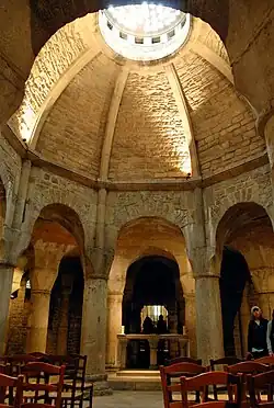 | Tipo | Iglesia de cruz latina, con nave central y dos laterales más bajas, con ábside central y dos absidiolos | |