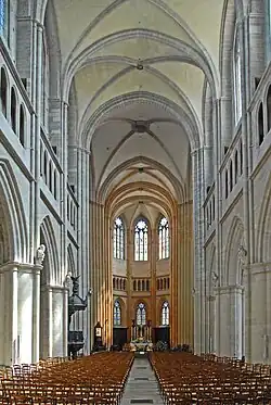 La nave tiene una altura de 27,50 m desde el suelo a la clave. Las bóvedas, cuatripartitas, tiene un esqueleto de ogivas, fajones y formeros. Los fajones y las ojivas descansan únicamente en los pilares a través de un haz de tres columnillas. Hay un triforio constituido por huecos de cuatro arcos —que corresponden con las cuatro lancetas de las ventanas altas— cuya pared de fondo es ciega, por encima del cual corre una galería alta. El muro de esta galería está perforado por una ventana dividida en dos por un parteluz central. Tres oculos. El conjunto es austero, pero destaca por la pureza de las líneas.